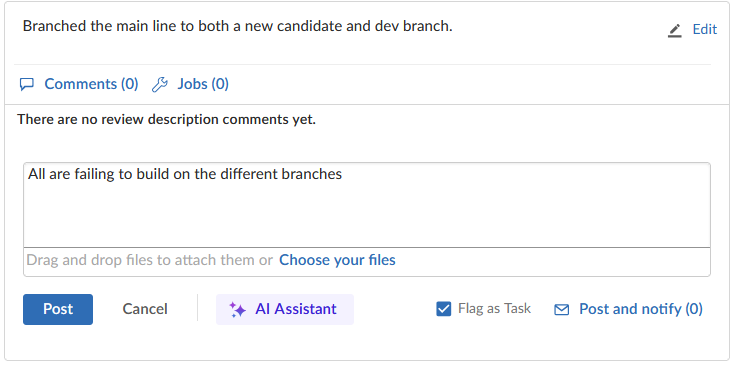 Comments are the primary feedback mechanism provided by P4 Code Review. Review comments can be flagged as tasks for a lightweight workflow within a review that helps authors and reviewers prioritize review feedback, see Tasks for details. By default, comment notifications are delayed to allow you to add or edit comments as you progress through a review without sending a notification for each individual comment on the review. Comment notifications are rolled up into a single notification that you can either leave to be sent automatically, or you can send manually, see Comment notification delay.